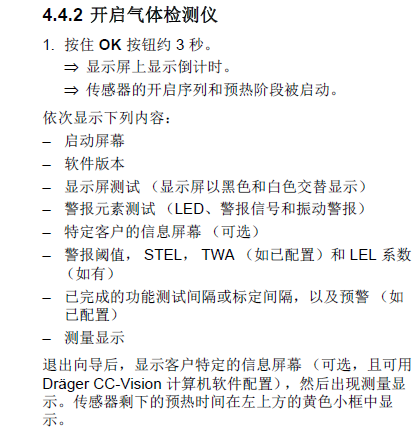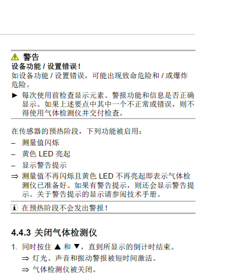 4.6運(yùn)行準(zhǔn)備 6 4.7在運(yùn)行期間 6 4.7.1測(cè)量模式 6 4.7.2 警報(bào) 特殊狀態(tài) 鎖定警報(bào) 刪除峰值 4調(diào)出快速菜單 5調(diào)出信息 8測(cè)量 9 4.6.1帶泵測(cè)量時(shí)的特點(diǎn) 9 4.6.2帶泵測(cè)量 9 4.7配置設(shè)備設(shè)置 10 4.7.1激活日或夜模式 10 4.7.2更改設(shè)備語(yǔ)言 10 4.7.3設(shè)置日期及時(shí)間 10 4.7.4啟用靜音模式 10 保養(yǎng) 10 5.1維護(hù)周期 10 5.2標(biāo)定間隔 10 5.3執(zhí)行功能測(cè)試 10 5.3.1通過(guò)向?qū)нM(jìn)行功能測(cè)試 10 5.4標(biāo)定氣體檢測(cè)儀 11 5.4.1進(jìn)行新鮮空氣標(biāo)定 11 5.5給電池充電 12 清潔 12 6.1設(shè)備設(shè)置 13 6.1.1出廠設(shè)置 13 6.1.2設(shè)備和傳感器設(shè)置 13 6.1.3警報(bào)設(shè)置 14 7 運(yùn)輸 14 8 儲(chǔ)存 14 9.廢棄處理 14 10.技術(shù)數(shù)據(jù) 14 10.1氣體檢測(cè)儀 14 10.2有毒有害物質(zhì)名稱及含量 15 |