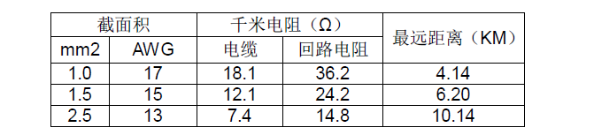 根據(jù)使用屏蔽線纜的技術(shù)參數(shù)可確定檢測(cè)儀的最遠(yuǎn)傳輸距離,見(jiàn)下表: